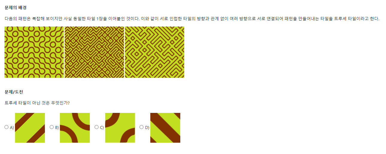타일을 네 개씩 붙여봤는데, C번 타일만 이음새가 맞지 않는 걸 확인할 수 있었습니다.