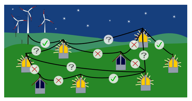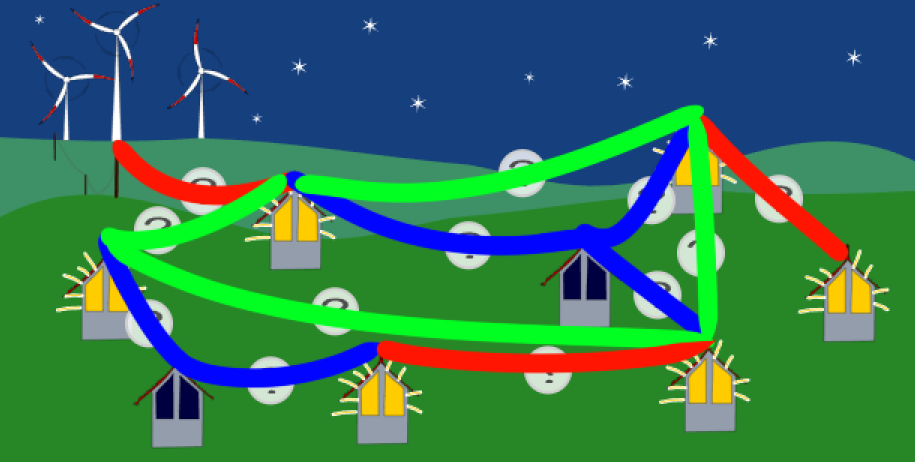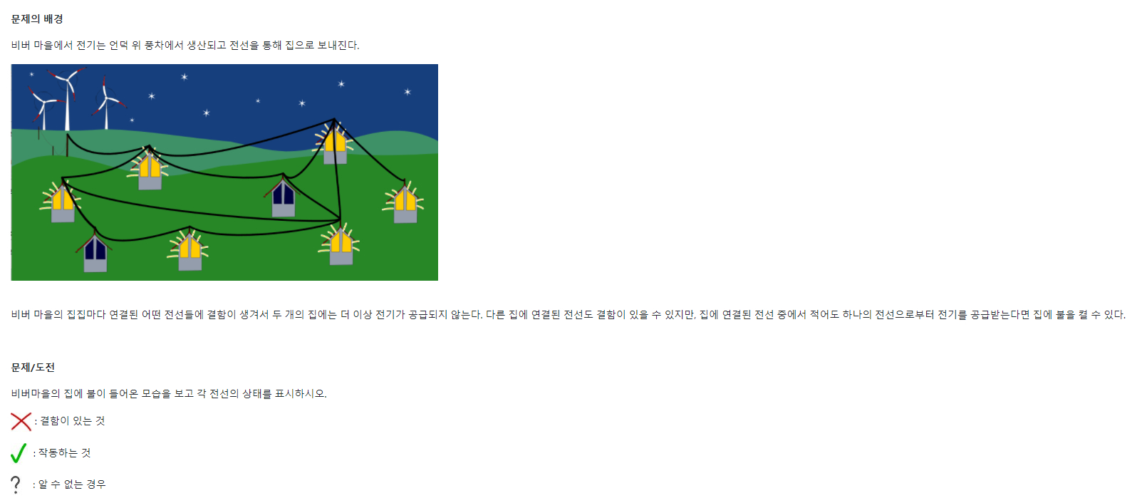 제일 오른쪽에 떨어진 집은 연결된 전선이 하나이므로 전기가 공급되어야 불이 켜질 수 있습니다.