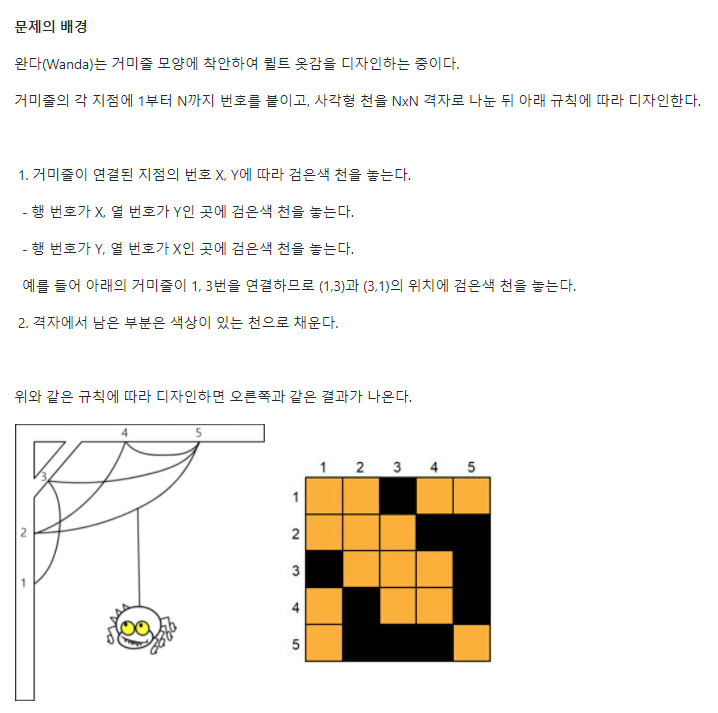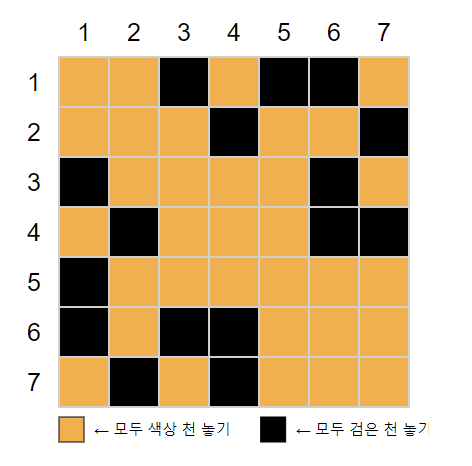 (1,3), (1,5), (1,6), (2,4), (2,7), (3,6), (4,6), (4,7)에 검은 천을 놓으면 된다.