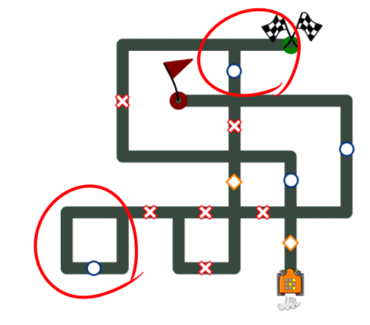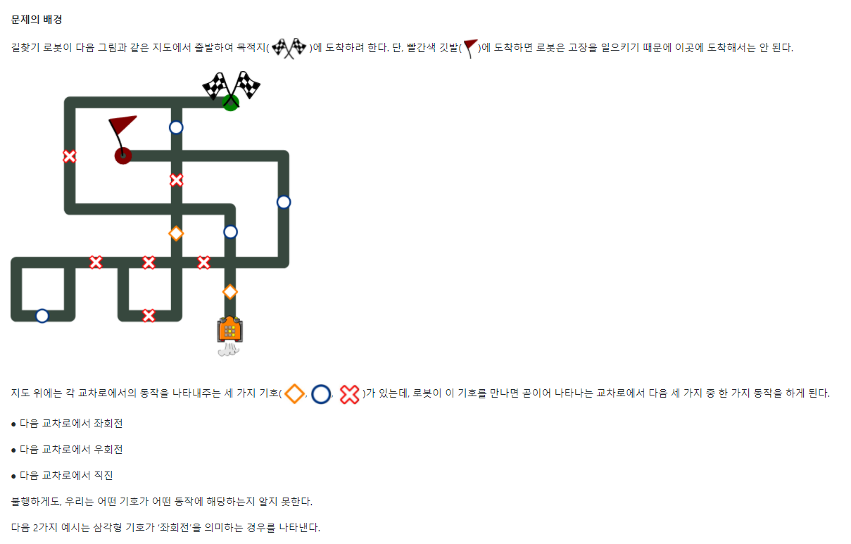 X가 직진, O가 우회전이라 할 때, ◇가 좌회전이여야만 도착지에 도달할 수 있습니다.