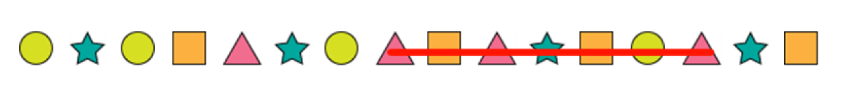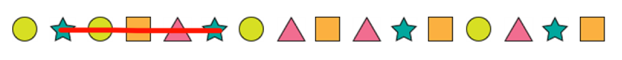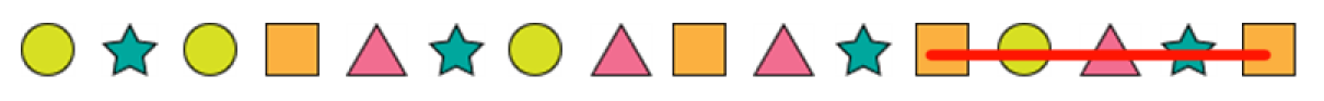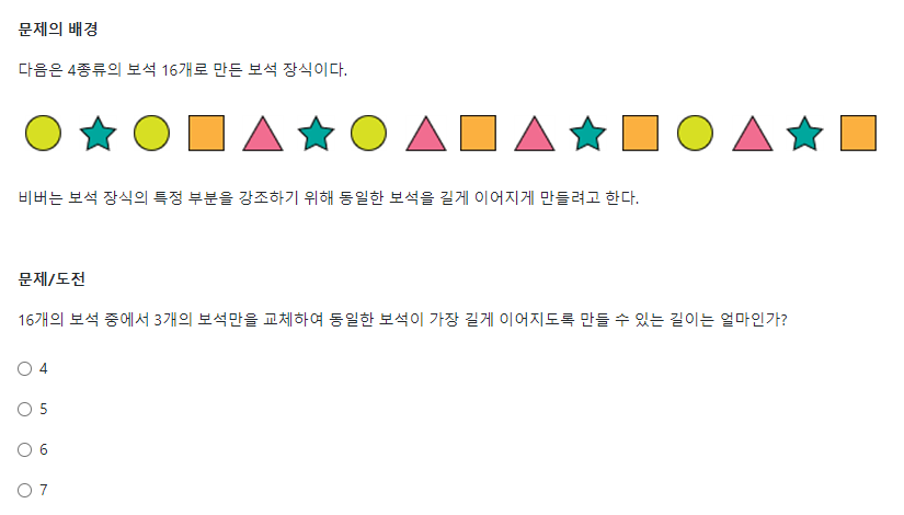 문제에 나온 보석의 종류가 4가지 (동그라미, 별, 네모, 세모)이므로 각 보석 별로 동일한 보석이 가장 길게 이어질 수 있도록 만드는 경우를 따지면 됩니다.