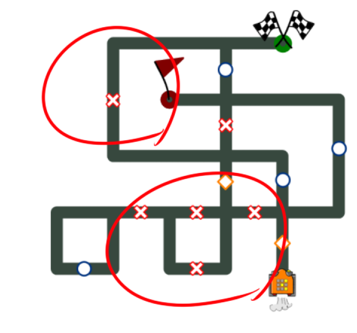 마찬가지로 표시해놓은 부분을 보면 X는 직진이여야 도착지에 도착할 수 있습니다.
