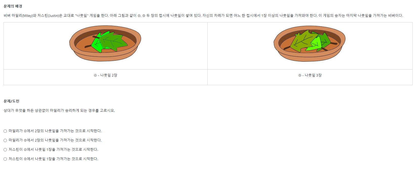 정답) 저스틴이 A에서 나뭇잎 1장을 가져가는 것으로 시작한다.