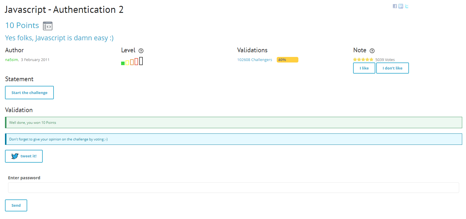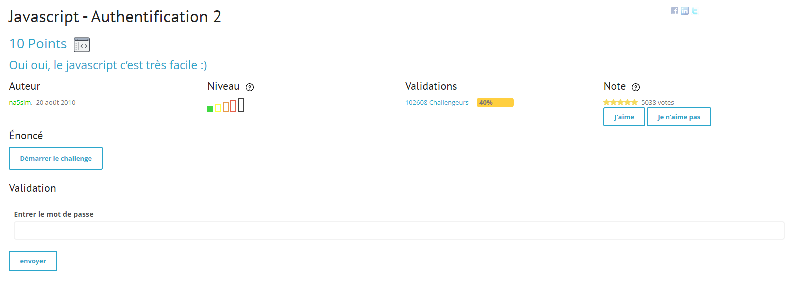 alert("Vous pouvez utiliser ce mot de passe pour valider ce challenge (en majuscules) / You can use this password to validate this challenge (uppercase)");