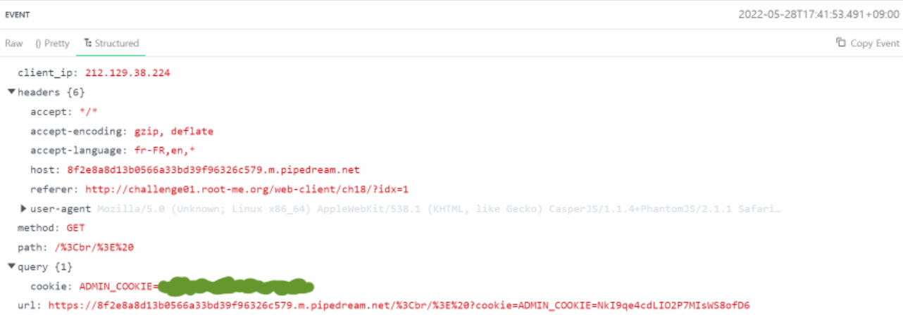 Message 부분에 페이로드를 넣어 보내준 다음 위 사이트에서 request를 받아서 Cookie값을 확인해주겠습니다.