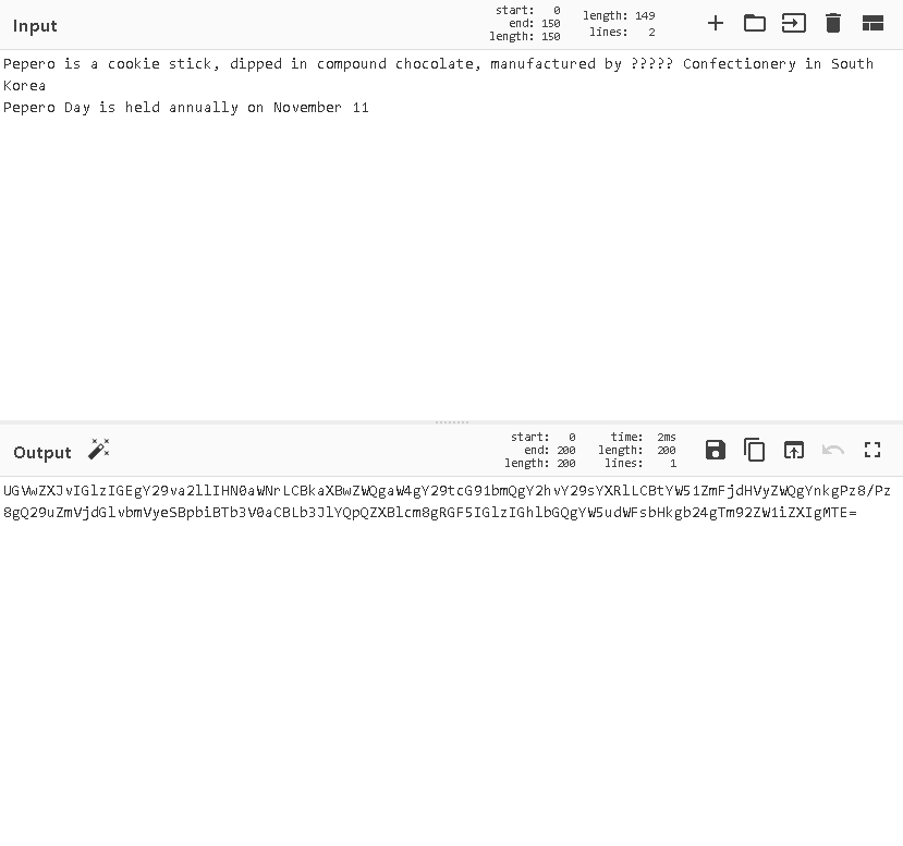 string text_in="UGVwZXJvIGlzIGEgY29va2llIHN0aWNrLCBkaXBwZWQgaW4gY29tcG91bmQgY2hvY29sYXRlLCBtYW51ZmFjdHVyZWQgYnkgPz8/Pz8gQ29uZmVjdGlvbmVyeSBpbiBTb3V0aCBLb3JlYQpQZXBlcm8gRGF5IGlzIGhlbGQgYW5udWFsbHkgb24gTm92ZW1iZXIgMTE=";