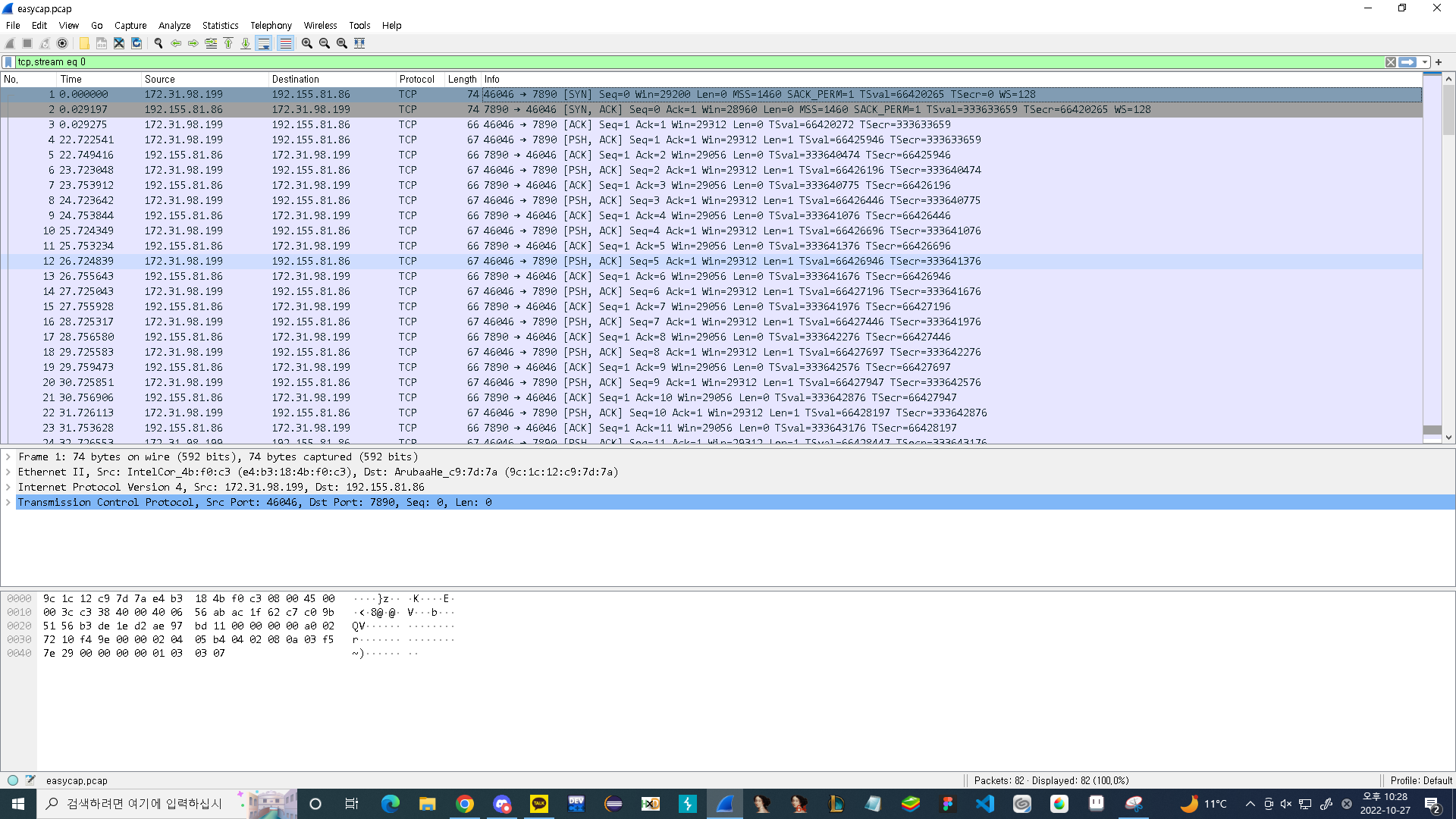 문제를 열어봤는데, TCP 패킷들이 잔뜩 들어있어서 TCP Stream부터 열어봤습니다.