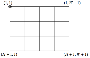 상근이가 사는 마을은 아래 그림과 같이 가로 방향 도로가 (H+1)개, 세로 방향 도로가 (W+1)개가 바둑판 모양으로 배치되어 있다. 상근이네 집은 가장 왼쪽 위 교차로에 있으며, 이곳에서 산책을 시작한다.