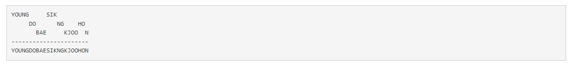 예를 들어, 오민식이 {YOUNGSIK, DONGHO, BAEKJOON} 총 3개를 가지고 있었다면, 오민식은 자기 마음대로 {YOUNG, SIK, DO, NG, HO, BA, E, K, JOO, N}과 같이 쪼갠 다음, 아래와 같이 YOUNGDOBAESIKNGKJOOHON을 만들 수 있다.