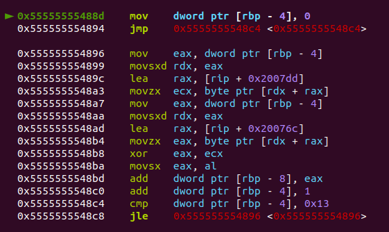 - jmp 0x5555555548c4 <0x5555555548c4> : 조건식으로 점프