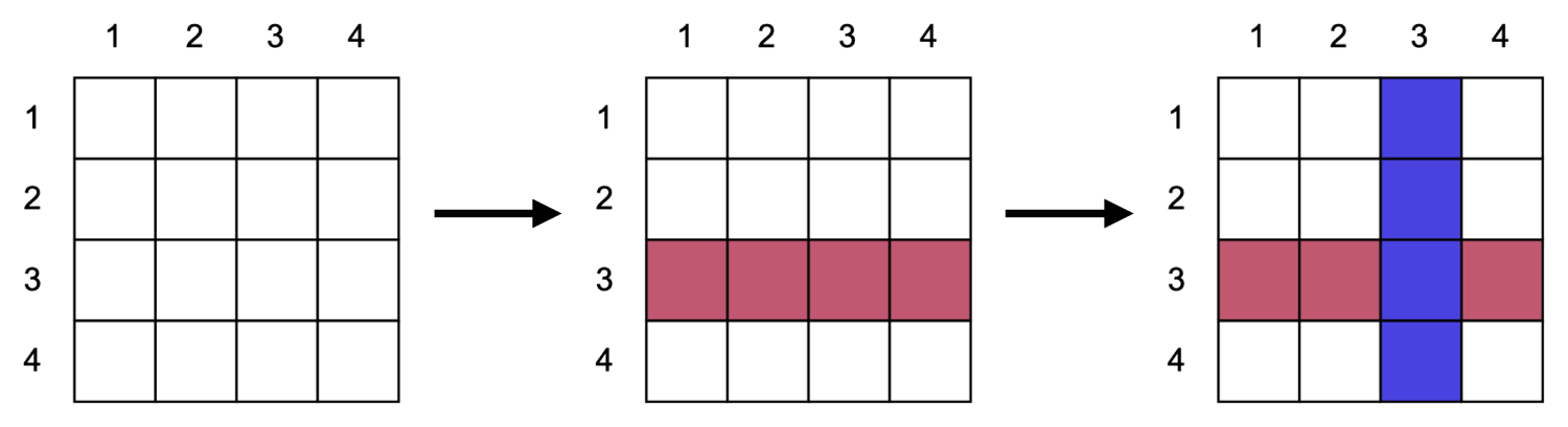 다음 <그림 1>은 번 행에 빨간색(번 색)을 칠하고 번 열에 파란색(번 색)을 칠했을 때의 과정을 보여준다.