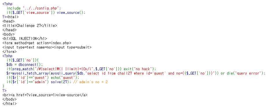 select id from chall27 where id='guest' and no=({$_GET['no']})