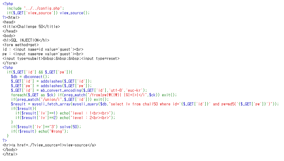 select lv from chall50 where id='{$_GET['id']}' and pw=md5('{$_GET['pw']}')
