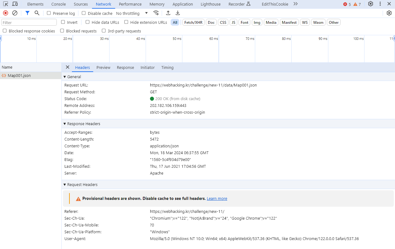 개발자 도구에서 뒤적거리던 중, Network 탭에서 Map001.json을 발견했습니다