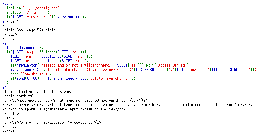 mysqli_query()를 보면, chall57의 pw를 찾아야 한다는 것을 알 수 있습니다