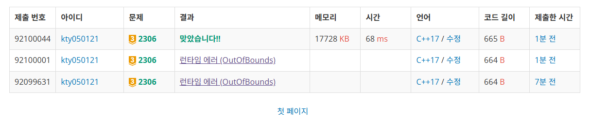 +) 저처럼 틀리지 마시고... 배열 인덱스가 넘어갈 걸 고려해서 DP 테이블 크기를 넉넉하게 잡아주시는 걸 추천드립니다.
