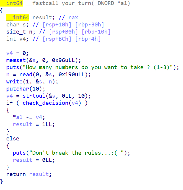 your_turn() 함수의 read 부분에서 BOF가 발생한다는 것을 발견하고, 이를 이용해 문제를 풀었습니다.