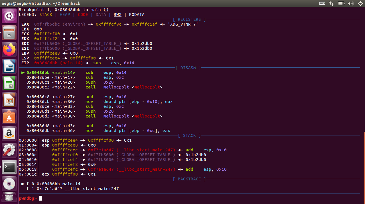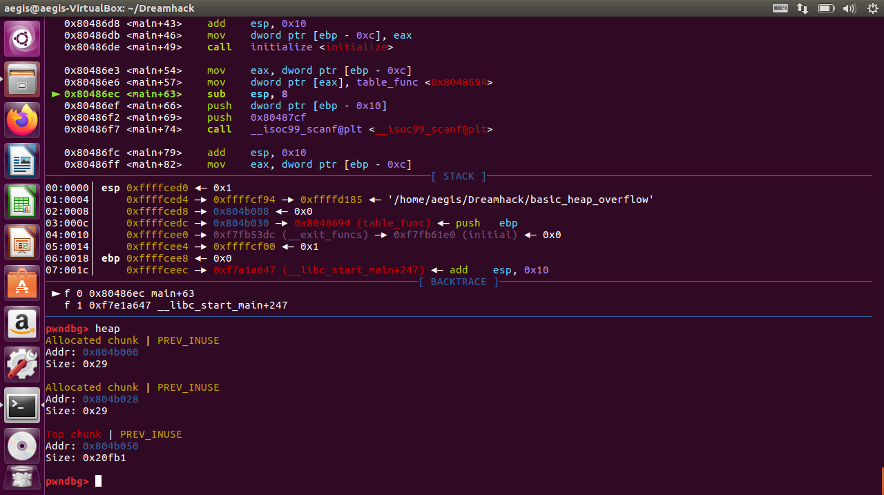 이제 scanf() 함수로 입력을 받기 직전까지 간 다음에 heap 상태를 다시 확인하겠습니다.