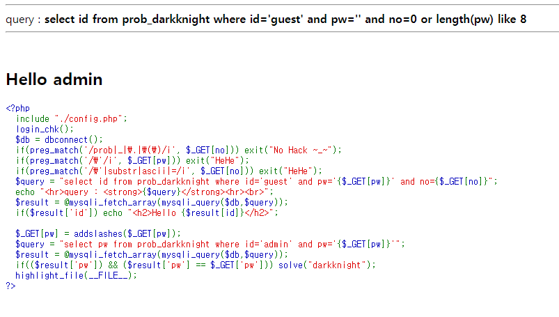 위의 구문을 쿼리에 삽입해서 Hello admin이 뜨는 경우를 확인해보겠습니다.
