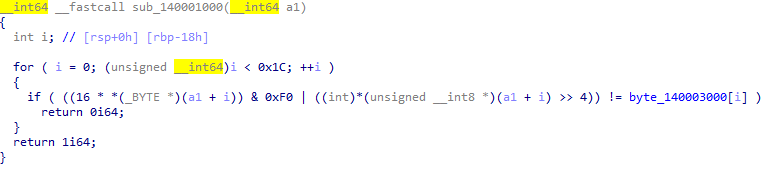 sub_140001000() 함수의 return값에 따라서 Correct, Wrong가 결정되므로 함수 안에 들어있는 for문을 분석하겠습니다.