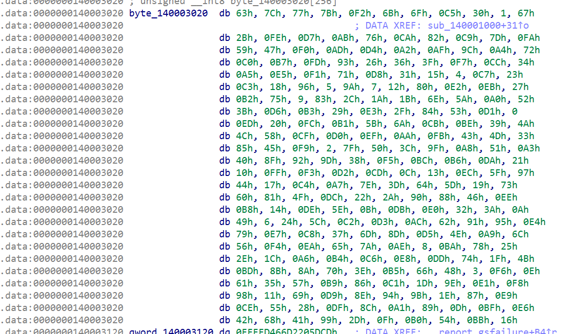 int brr[]={0x63, 0x7C, 0x77, 0x7B, 0xF2, 0x6B, 0x6F, 0xC5, 0x30, 0x01, 0x67, 0x2B, 0xFE, 0xD7, 0xAB, 0x76, 0xCA, 0x82, 0xC9, 0x7D, 0xFA, 0x59, 0x47, 0xF0, 0xAD, 0xD4, 0xA2, 0xAF, 0x9C, 0xA4, 0x72, 0xC0, 0xB7, 0xFD, 0x93, 0x26, 0x36, 0x3F, 0xF7, 0xCC, 0x34, 0xA5, 0xE5, 0xF1, 0x71, 0xD8, 0x31, 0x15, 0x04, 0xC7, 0x23, 0xC3, 0x18, 0x96, 0x05, 0x9A, 0x07, 0x12, 0x80, 0xE2, 0xEB, 0x27, 0xB2, 0x75, 0x09, 0x83, 0x2C, 0x1A, 0x1B, 0x6E, 0x5A, 0xA0, 0x52, 0x3B, 0xD6, 0xB3, 0x29, 0xE3, 0x2F, 0x84, 0x53, 0xD1, 0x00, 0xED, 0x20, 0xFC, 0xB1, 0x5B, 0x6A, 0xCB, 0xBE, 0x39, 0x4A, 0x4C, 0x58, 0xCF, 0xD0, 0xEF, 0xAA, 0xFB, 0x43, 0x4D, 0x33, 0x85, 0x45, 0xF9, 0x02, 0x7F, 0x50, 0x3C, 0x9F, 0xA8, 0x51, 0xA3, 0x40, 0x8F, 0x92, 0x9D, 0x38, 0xF5, 0xBC, 0xB6, 0xDA, 0x21, 0x10, 0xFF, 0xF3, 0xD2, 0xCD, 0x0C, 0x13, 0xEC, 0x5F, 0x97, 0x44, 0x17, 0xC4, 0xA7, 0x7E, 0x3D, 0x64, 0x5D, 0x19, 0x73, 0x60, 0x81, 0x4F, 0xDC, 0x22, 0x2A, 0x90, 0x88, 0x46, 0xEE, 0xB8, 0x14, 0xDE, 0x5E, 0x0B, 0xDB, 0xE0, 0x32, 0x3A, 0x0A, 0x49, 0x06, 0x24, 0x5C, 0xC2, 0xD3, 0xAC, 0x62, 0x91, 0x95, 0xE4, 0x79, 0xE7, 0xC8, 0x37, 0x6D, 0x8D, 0xD5, 0x4E, 0xA9, 0x6C, 0x56, 0xF4, 0xEA, 0x65, 0x7A, 0xAE, 0x08, 0xBA, 0x78, 0x25, 0x2E, 0x1C, 0xA6, 0xB4, 0xC6, 0xE8, 0xDD, 0x74, 0x1F, 0x4B, 0xBD, 0x8B, 0x8A, 0x70, 0x3E, 0xB5, 0x66, 0x48, 0x03, 0xF6, 0x0E, 0x61, 0x35, 0x57, 0xB9, 0x86, 0xC1, 0x1D, 0x9E, 0xE1, 0xF8, 0x98, 0x11, 0x69, 0xD9, 0x8E, 0x94, 0x9B, 0x1E, 0x87, 0xE9, 0xCE, 0x55, 0x28, 0xDF, 0x8C, 0xA1, 0x89, 0x0D, 0xBF, 0xE6, 0x42, 0x68, 0x41, 0x99, 0x2D, 0x0F, 0xB0, 0x54, 0xBB, 0x16, 0x17, 0x8B, 0x93, 0xE9, 0x4B, 0x53, 0xFF, 0xFF, 0xE8, 0x74, 0x6C, 0x16, 0xB4, 0xAC};